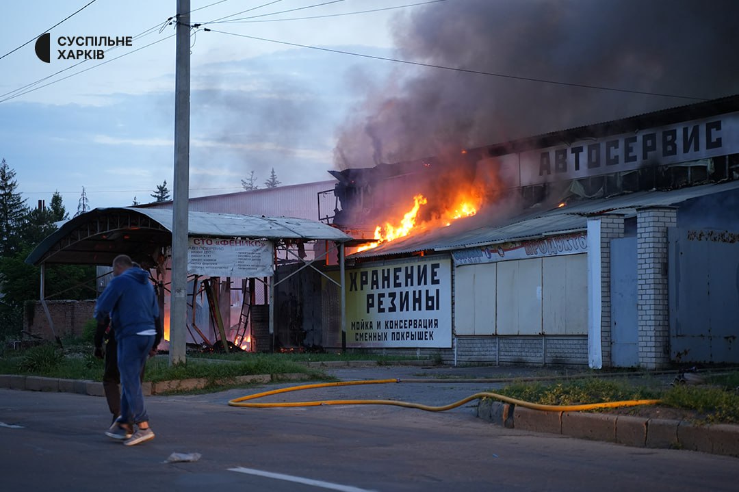 У промисловій зоні міста спалахнули масштабні пожежі — горять склади з автомобільними шинами, густий чорний дим видно над північно-західною частиною Харкова. У Новобаварському районі пошкоджено промислову будівлю, приватний будинок і СТО. Постраждав один чоловік. На місцях працюють рятувальники та волонтери.