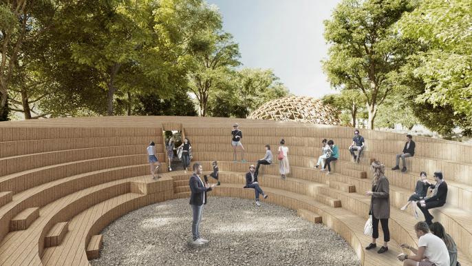 «Чаша амфитеатр – это кульминация идеи укрытия, рабочее название – ковчег. Для реализации мы планируем использовать технологию постройки деревянных кораблей. Площадка – строительная площадка с природными материалами: водой из колонки, песком и камнями, мы предлагаем детям не готовые элементы с четко определенной функцией, а материалы, которые будут стимулировать творческую игру и кооперацию» - так пишут разработчики о главной «фишке» проекта.
