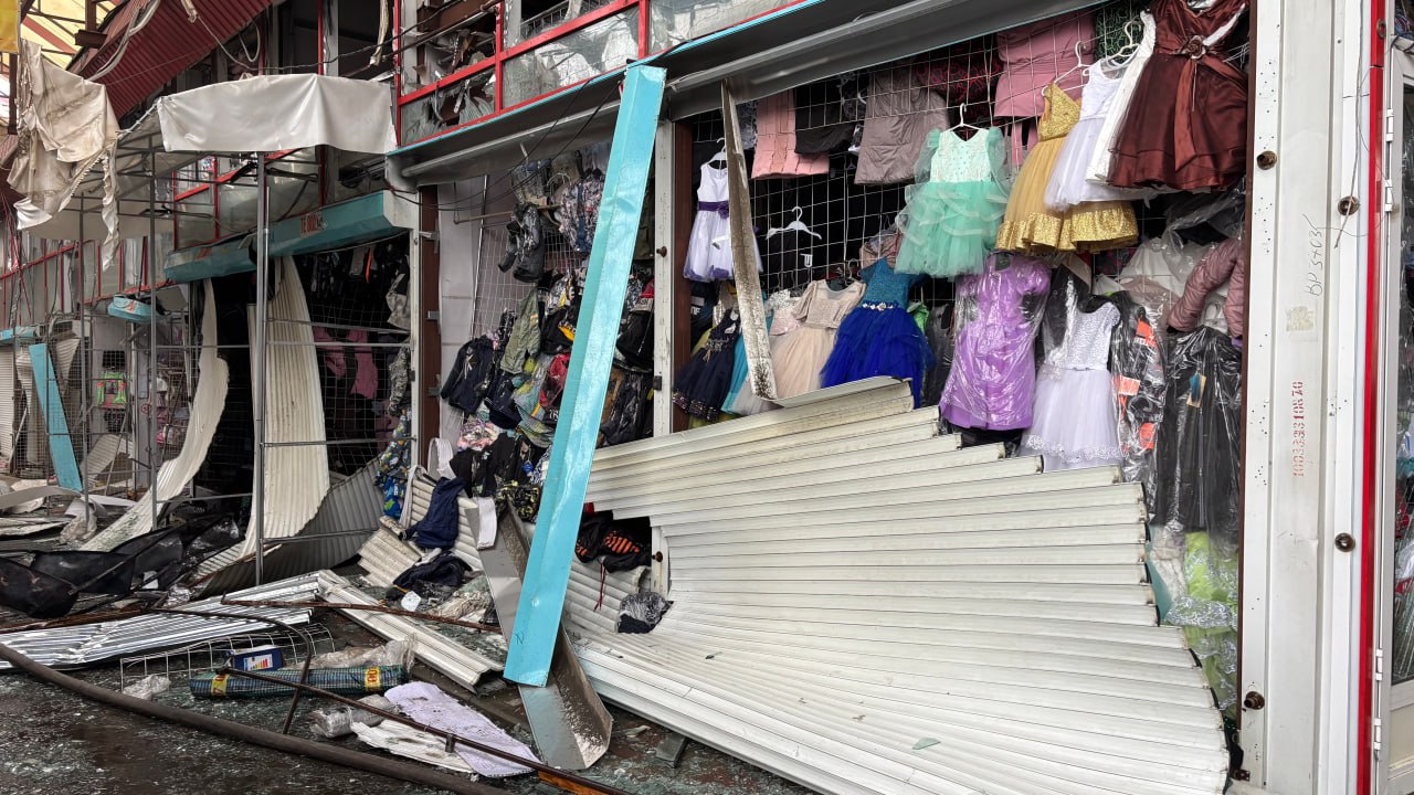 Огонь уничтожил три торговых блока — это ориентировочно 90 магазинов, специализирующихся на продаже детской одежды, игрушек и сопутствующих товаров. Кроме того, ещё примерно столько же павильонов получили повреждения: выбиты окна, деформированы роллеты, пострадали фасады и стены.