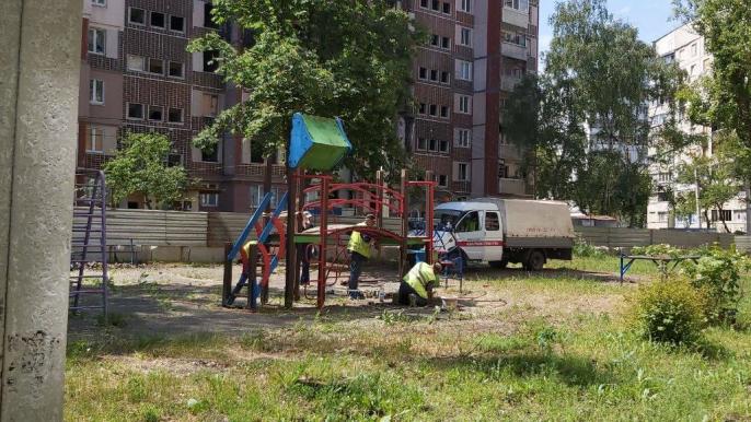 На Северное Салтовке возле разрушенного дома устанавливают детскую площадку