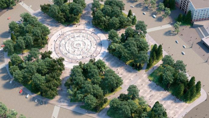 Основным элементом завершающего этапа реконструкции будет «сухой» фонтан, который будет состоять из семи технологических колец. Они будут подсвечиваться светодиодами.