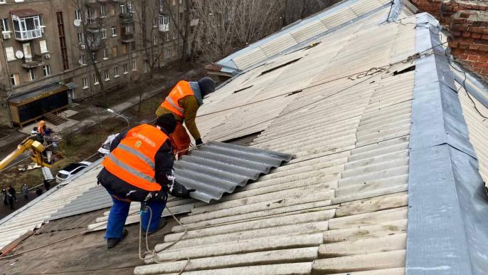 Там комунальники закрили понад 350 вікон. Зараз вони укріплюють їх та ремонтують майже 300 кв. м покрівлі.