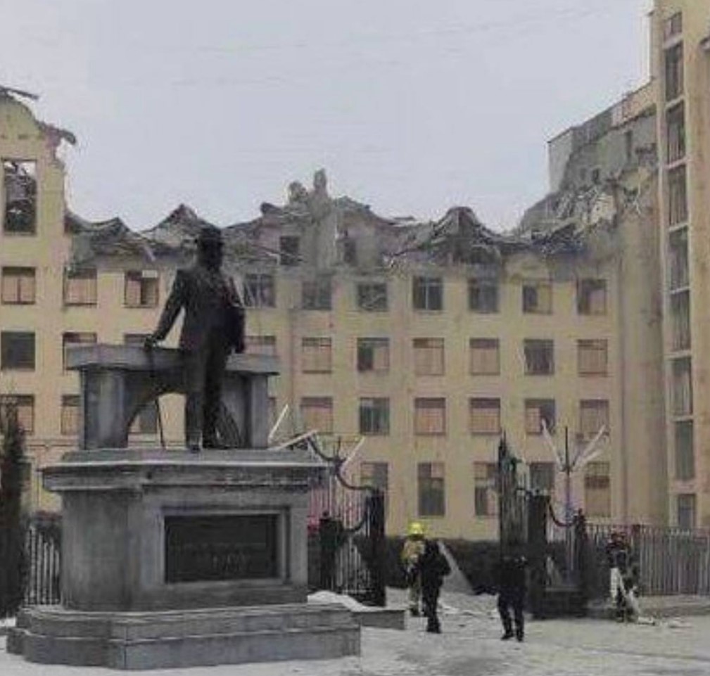 Февраль 2023 года стал трагическим: российская ракета разрушила три из семи этажей главного корпуса, уничтожив 7000 м². По словам преподавателя Олега Калмыкова, который возглавил создание проектной документации, уже через полчаса после удара на месте собрались более 100 человек: преподаватели, студенты, аспиранты. Это была реакция на личную боль — разрушение собственной "домовки".