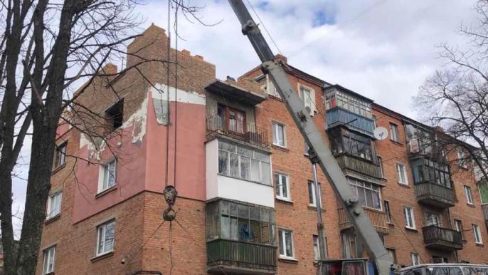 Робітники вже розібрали завали,  демонтували  і відновили плити перекриття. Наразі виконуються роботи з відновлення цегляної кладки парапету, стін у квартирах  мешканців та фасадів.
