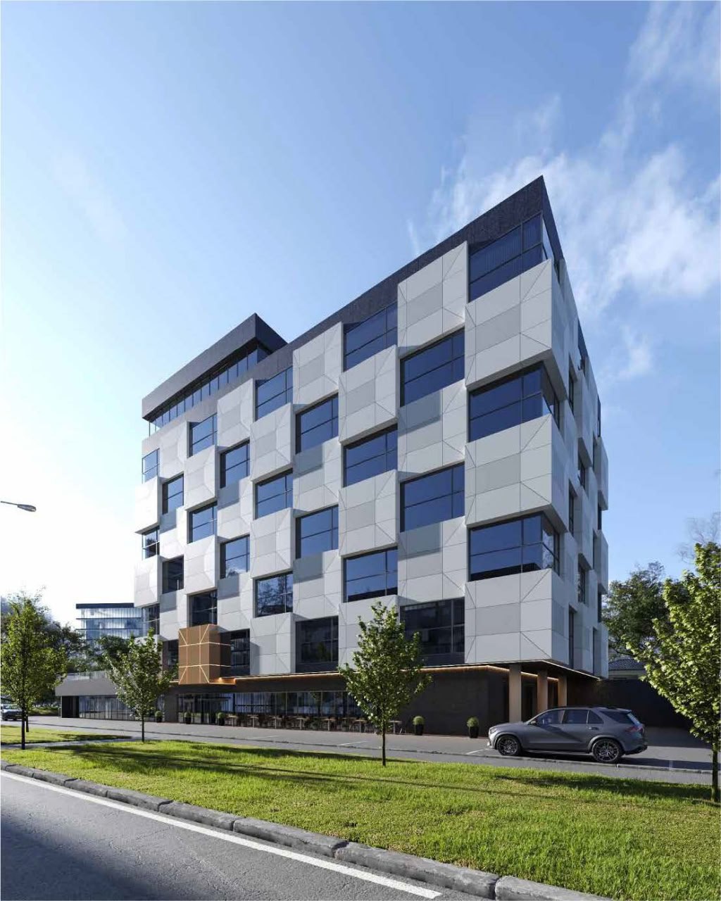 На первых визуализациях проекта было предусмотрено благоустройство с сохранением зелёных насаждений, однако на деле коммерческие интересы победили экологические ценности
