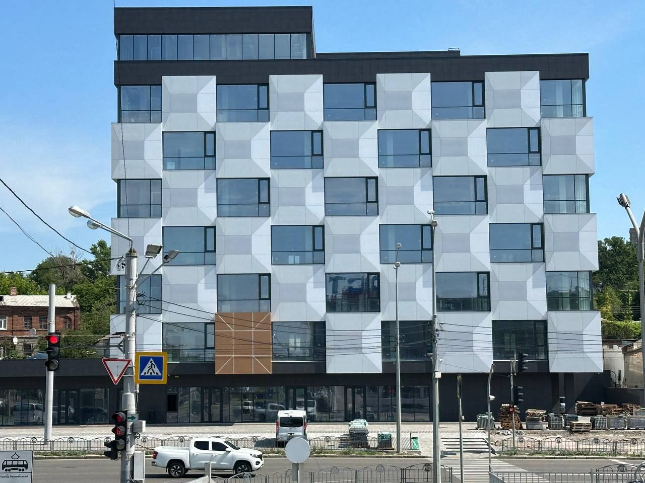 Самые худшие опасения подтвердились — застройщик полностью уничтожил зелёную зону возле нового офисного центра напротив "Роста" на Клочковской. Вместо обещанного озеленения территорию отдали под расширение парковки.
