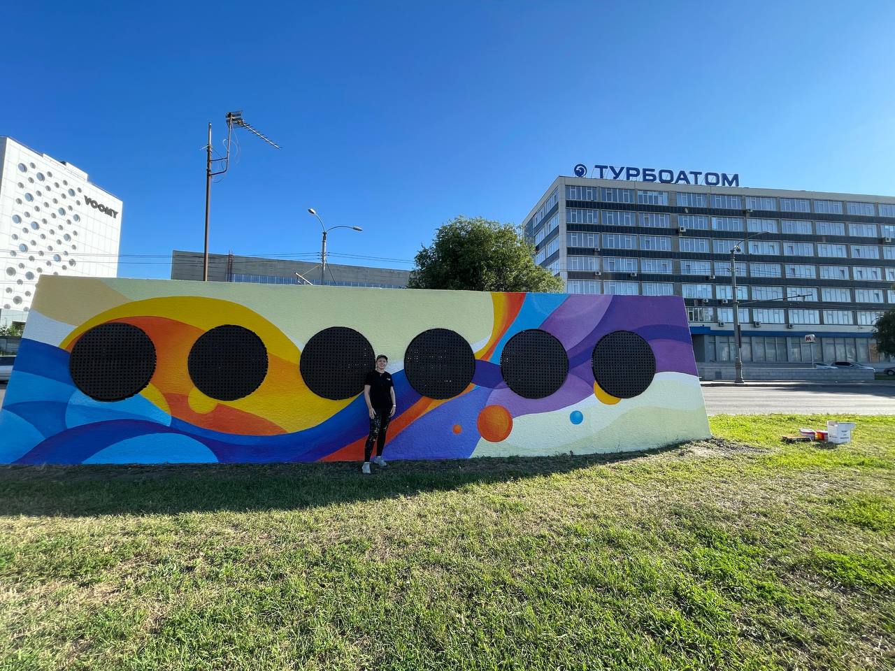 «Эта роспись — пример современного городского искусства, которое оживляет индустриальное пространство. Стену украшают абстрактные линии, которые будто пульсируют энергией и движением. Цветовая палитра насыщенная и контрастная — от тёплых жёлтых и оранжевых до глубоких синих и фиолетовых оттенков», — рассказывает Анастасия Худякова.