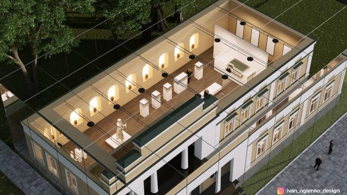 Дизайнер @ivan_ogienko_design предлагает накрыть дом стеклянным куполом, крышу оставить в разрушенном виде, а внутри сделать современный музей.
