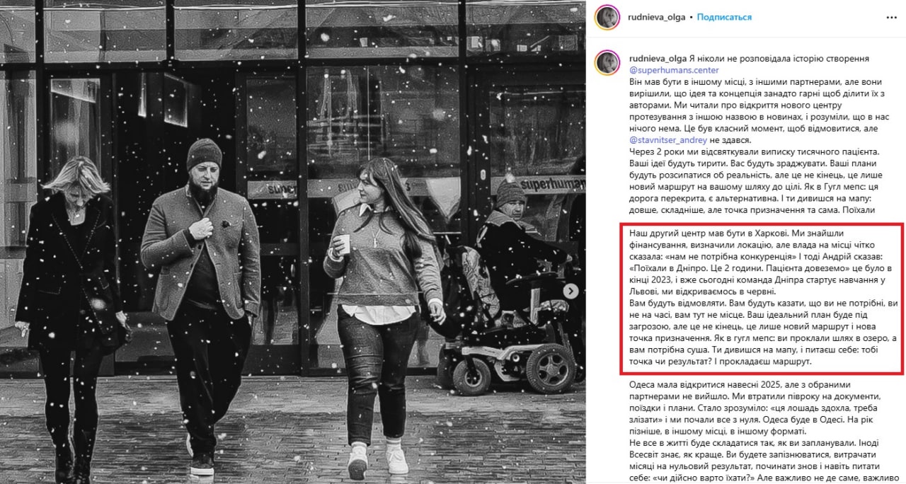 В Харькове не состоялось открытие реабилитационно-протезного центра «Superhumans», несмотря на готовность проекта к запуску. По словам СЕО проекта Ольги Рудневой, причиной стали деструктивные действия местных властей, которые прямо заявили, что им «не нужна конкуренция».