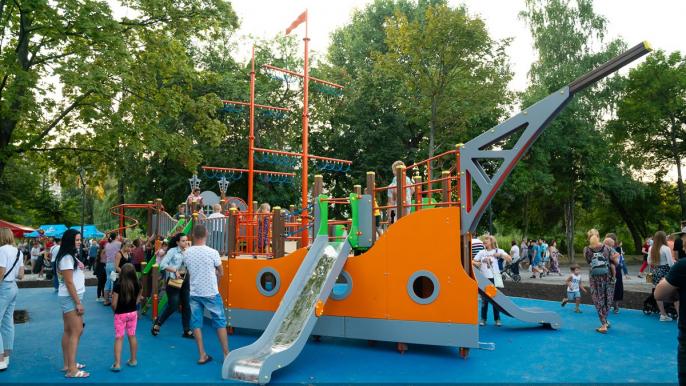 В парке установили детскую и спортивную площадки, площадка для выгула собак, скалодром.