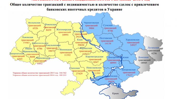 Интересносно, что активность рынка недвижимости выросла по сравнению с 2015-м во всех областях. Лидером по темпам роста стали Луганская (+48%) и Донецкая (+36%) области, но в абсолютных числах, по понятным причинам, они далеки до докризисных объемов.