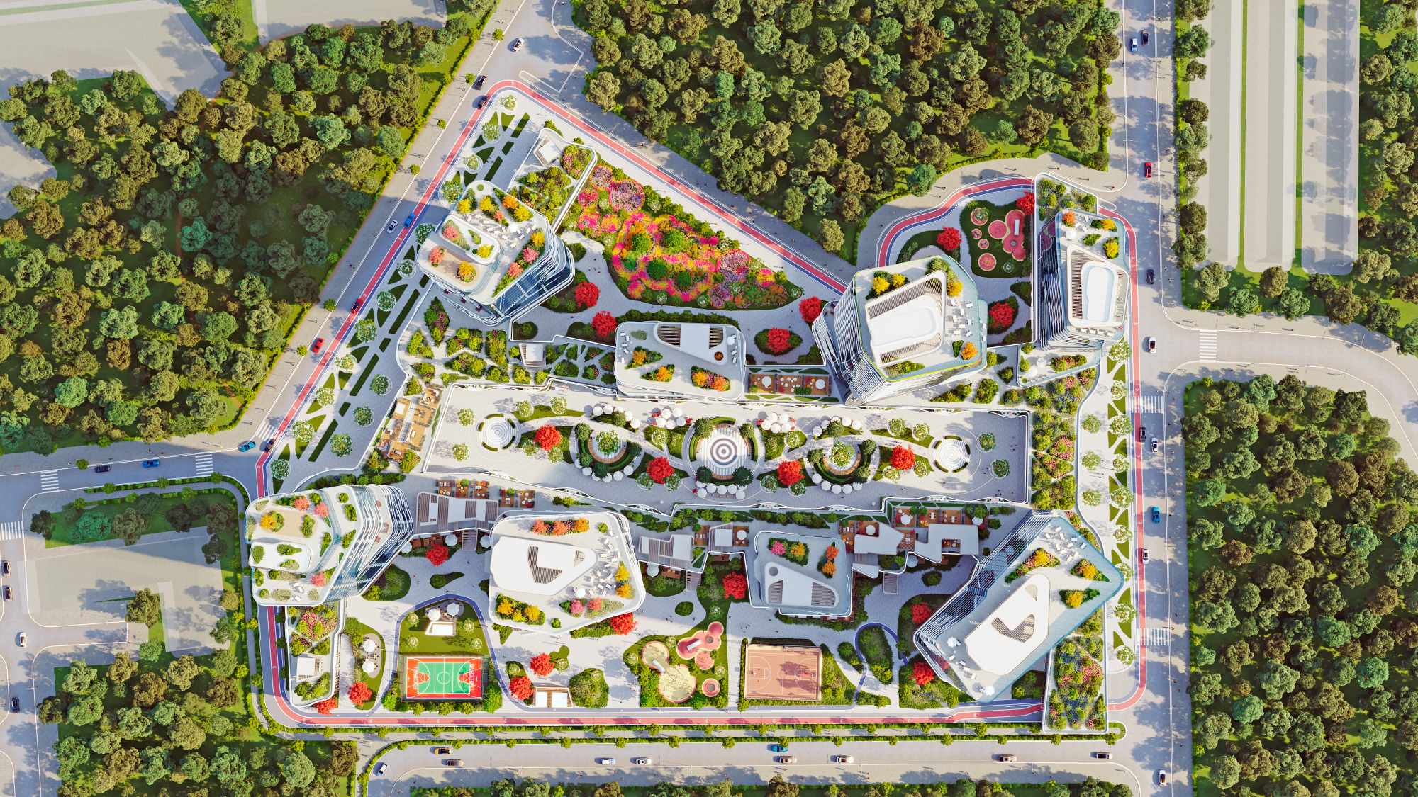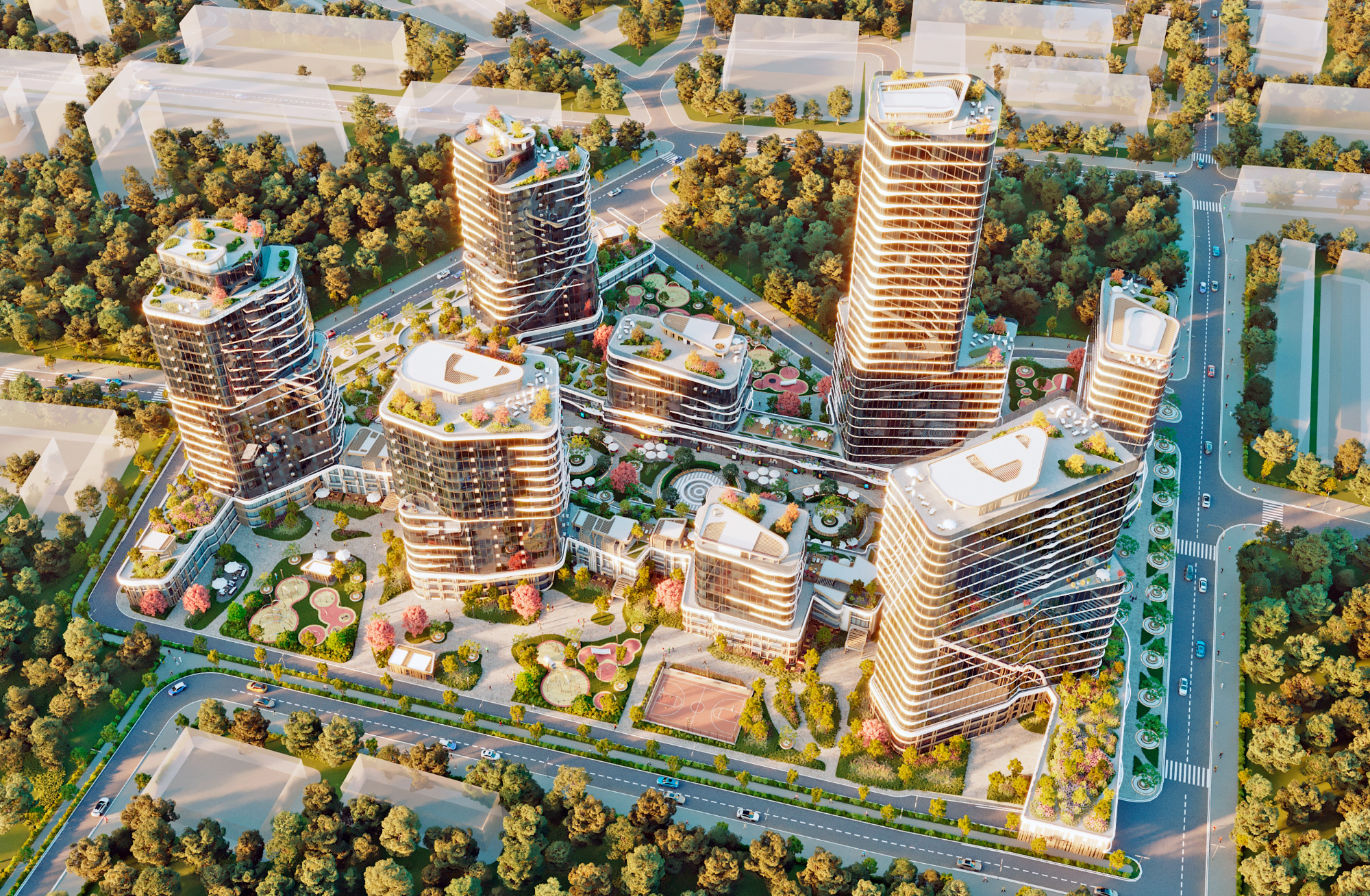 В основу проекта заложены принципы высокой безопасности, рационального использования времени, лёгкого и удобного формирования ритма жизни современного жителя мегаполиса. Комплекс сочетает открытость общественных зон и приватность жилых пространств и дворов.