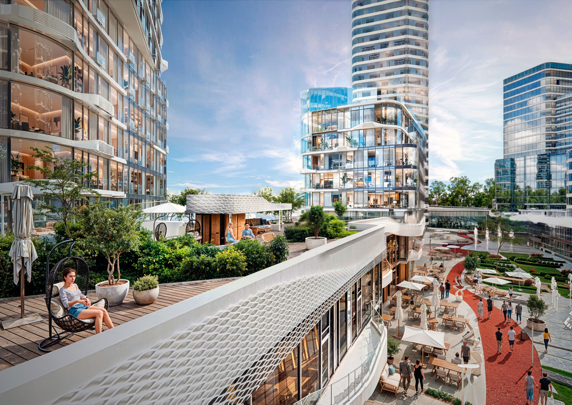 Развитая инфраструктура начинает работать уже с первой очередью комплекса: инновационный детский сад полного дня, премиальный спортивный комплекс с бассейном и SPA, торговые галереи, помещения для бизнеса и социальной активности.