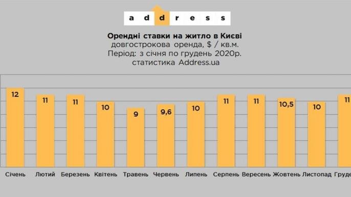 В последнем месяце 2020 года медианная цена аренды квартир в Киеве показала рост, и составила 11 долл. США/кв.м.
