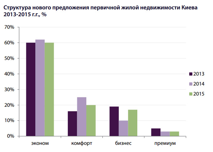"Новый тренд 2015года - рост в структуре предложения доли квартир-студий площадью до 35 кв. м (3% от общего объема). Квартиры-студио формируют предложение не только в сегменте бюджетного жилья, но и в объектах класса бизнес. 60% нового предложения сконцентрировано в Дарницком, Подольском и Печерском районах. Особое внимание заслуживает Подольский район, где началось развитие сразу 3 масштабных проектов эконом класса: ЖК "Кристер Град", ЖК "Варшавский Микрорайон" и комплекса по ул. Новомостицкая - ул. Замковецкая», – говорят эксперты.