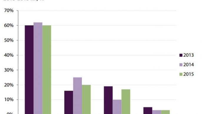 По сравнению с 2014 годом объем нового предложения вырос на 28%, при этом основной прирост обозначился за счет начала строительства крупных проектов ЖК "Варшавский Микрорайон", ЖК "Кристер Град", ЖК "Французский квартал 2", ЖК "Традиция", ЖК "Эврика", ЖК Bergen и комплекса по ул. Замковецкая - ул. Новомостицкая.