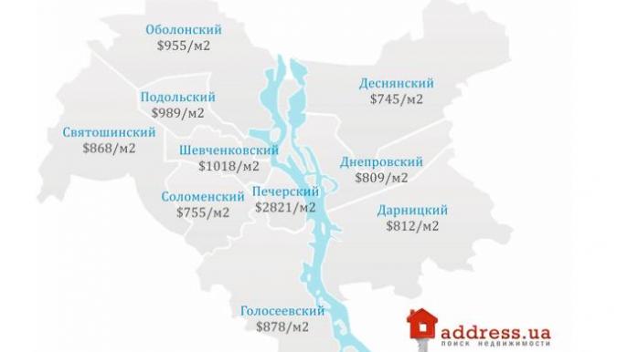 Одним из самых дорогих районов в столице по-прежнему остается Печерский район – 2 821 долл. США/кв.м. На втором месте Шевченковский район, где медианная цена составила 1018 долл. США/кв.м. Цена в Подольском районе составила 989 долл. США/кв.м. Минимальная цена – 745 долл. США/кв.м зафиксирована в Деснянском районе.