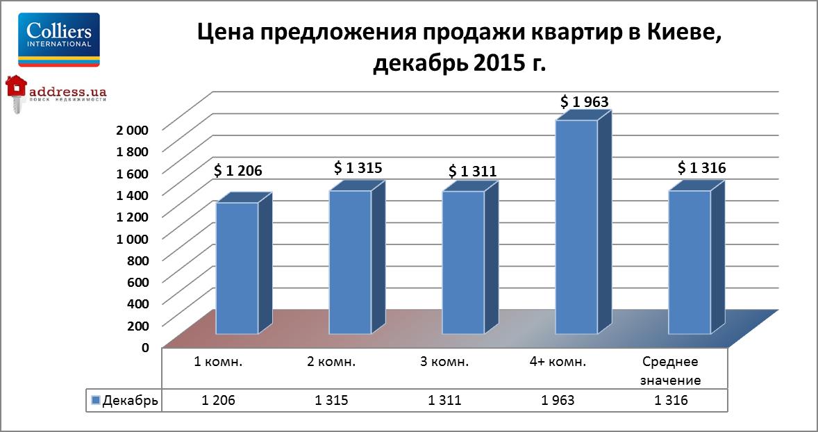 По итогам декабря 2015 года коррекция цен на вторичном рынке Киева составила 1,1%, достигнув значения 1316 дол/кв.м. Медианная цена однокомнатных квартир снизилась более существенно в сравнении с двух- и трехкомнатными, превысив 2% в последнем месяце года. Таким образом, медианная цена предложения однокомнатных объектов составила 1206 дол/кв.м, двухкомнатных – 1315 дол/кв.м, трехкомнатных – 1311 дол/кв.м. Медианная цена предложения четырехкомнатных по-прежнему существенно выше остальных групп квартир со значением 1963 дол/кв.м. За последние 12 месяцев падение цен предложения объектов, составило 20%.