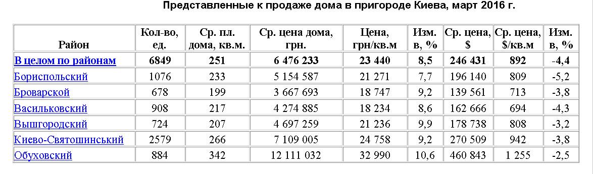 В марте 2016 г. наибольшее количество частных домов предлагалось в Киево-Святошинском районе (38%), в Бориспольском – 16%, в Васильковском и Обуховском районах – по 13%. Наименьшее количество в Броварском и Вышгородском – по 10%. Увеличение предлагаемого к продаже жилья наблюдалось во всех районах, наибольшее – в Вышгородском, на 16,2%, в Броварском – на 15,1%. В остальных районах увеличение составило от 0,5% до 11,9%.