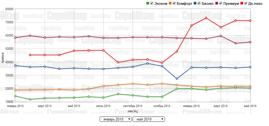 Что касается распределения цен по классам жилья, то больше всего изменились цены на квартиры в новостройках бизнес и премиум. 36 204 грн. за кв. м (1,7%) и 55 091 грн. за кв. м (1,7%) соответственно. По остальным показателям, в эконом-классе стоимость составила 20 317 грн. за кв. м (-1,6%), комфорт – 21 841 грн. за кв. м (0,6%), де-люкс – 71 280 грн. за кв. м (-0,1%).