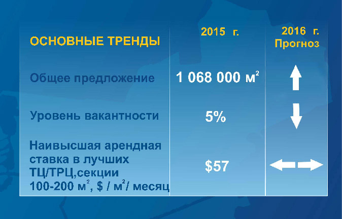 Многие тенденции 2014 года имели место и в 2015 году: сохранение умеренного спроса на торговые помещения Киева со стороны арендаторов, а также избирательный подход арендаторов к выбору проектов и условиям аренды, с особым вниманием к качеству концепции проекта и его конкурентоспособности. Начиная со второго квартала 2015 года, наблюдалось постепенное оживление спроса, на фоне относительной стабилизации валютного курса гривны, что привело к стабилизации гривневых товарооборотов многих ритейлеров и активизации некоторых групп арендаторов. В частности, спрос в 2015 году формировался в основном арендаторами продуктового ритейла, магазинами повседневного спроса, ювелирных изделий и заведений общественного питания.