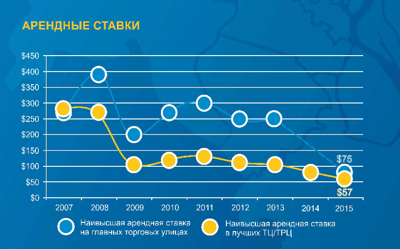 На конец 2015 года наивысшие арендные ставки на секции 100-200 м² в наиболее успешных ТЦ/ТРЦ Киева составили $57/м²/месяц, снизившись на 19% по сравнению с концом 2014 года. Как и в 2014 году, в 2015 году многие арендодатели шли на уступки для качественных арендаторов и фиксировали арендные ставки в гривневом эквиваленте на начальные периоды, а также привязывали арендную плату к проценту от товарооборота. При этом собственники даже самых сложных и закредитованных проектов предпочитали находить компромисс с арендаторами, чтобы не увеличивать уровень вакантности.