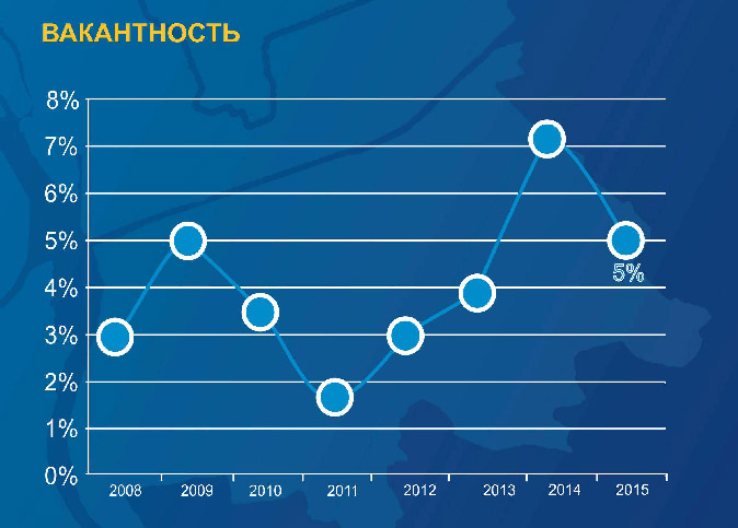 В соответствии с ранее сделанными прогнозами, общий уровень вакантности в ТЦ/ТРЦ г. Киева в 2015 году снизился с 7,1 % до 5%. При этом, в успешных ТЦ/ТРЦ вакантные помещения практически отсутствовали.