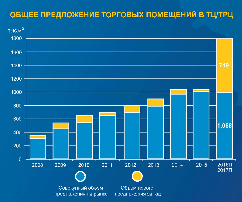 А ввод в эксплуатацию некоторых ТЦ/ТРЦ, ранее анонсированных к открытию в 2015 году, был перенесен на более поздние сроки, в частности: ТРЦ New Way (GLA: ~17 000 м²), 2-й очереди аутлет-городка «Мануфактура» (GLA: ~6 600 м²), ТРЦ Respublika (GLA: ~135 000 м²), ТРЦ Lavina Mall (GLA: ~142 000 м²) и ТРЦ RETROVILLE (GLA: ~83 000 м²).