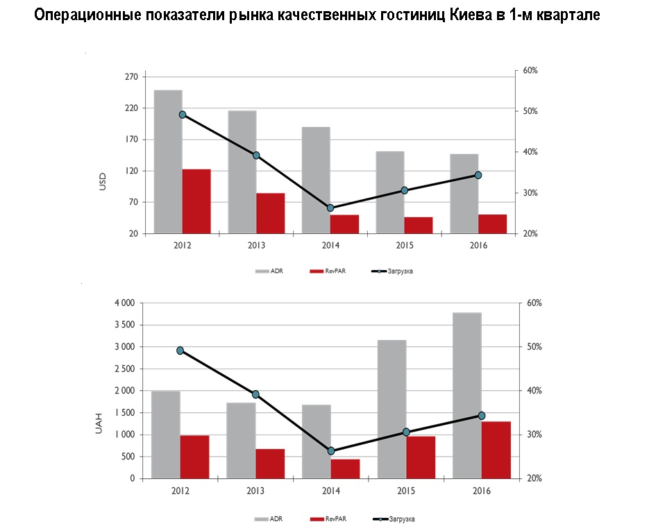 "В то же время ценовые позиции отелей в локальной валюте значительно упрочились за последние два года. По сравнению с 1-м кварталом 2014 года средний тариф вырос на 124% и почти на 20% по сравнению с аналогичным периодом 2015 года. Абсолютное значение показателя на рынке качественных отелей Киева составило порядка 3,8 тыс. грн. за номер. Рост среднего тарифа в локальной валюте очень важен, ведь именно в гривнах традиционно рассчитывается структура расходов отелей, самая крупная статья которых – заработная плата персонала – сохранилась в основном на уровне 2013-2014 годов", – добавила эксперт.