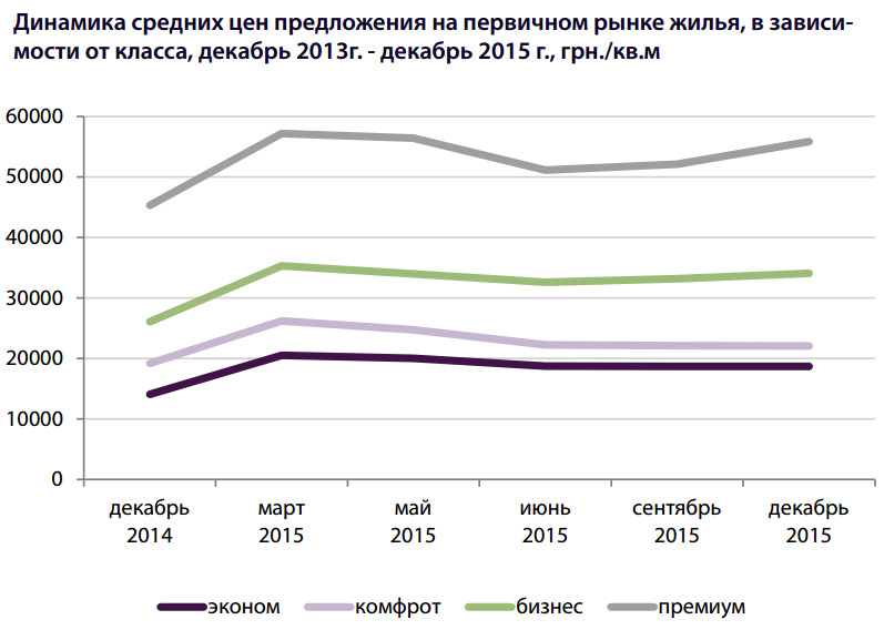 "Средневзвешенная цена на первичном рынке жилой недвижимости Киева по итогам 2015-го составила 24 450 грн./кв. м, прирост по итогам года составил 27,5% (по сравнению с декабрем 2014г.). В зависимости от класса жилья годовой прирост цены составил в сегменте эконом класса +32,7%, комфорт +15,0%, бизнес +30,6%, премиум +23,3%. К декабрю средневзвешенная цена выросла всего на 2,5%, при этом, больше выросли цены в сегменте премиум на 9,2% и бизнес на 4,6%, за счет фиксации по проектам цен в долларах США. По состоянию на декабрь самое дешевое жилье в сегменте эконом класса можно приобрести за 12 100 грн./кв. м в панельном доме на начальной стадии строительства. Самая высокая цена предложения в сегменте премиум класса отмечена в сданных жилых комплексах на Печерске – 84 000 грн./кв. м", – добавили в компании.