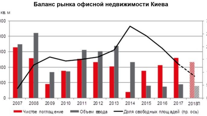 «Если спрос окончательно восстановился после кризиса, то предложение на рынке растет не такими высокими темпами. Рынок офисной недвижимости Киева в 4-м квартале 2017 года увеличился на 6 тыс. кв. м и на 44,1 тыс. кв. м в целом за год. Итоговый показатель на 21% больше результата 2016 года, но в четыре раза меньше докризисных уровней 2011-2013 годов. Более того, мы ожидаем, что в 2018 объем ввода не превысит 40 тыс. кв. м. По мере снижения вакантности и при макроэкономической стабильности девелоперы возобновят строительство офисных комплексов, которые будут вводиться в 2019 году и далее», - добавила аналитик компании JLL (Украина) Дарина Кулага.
