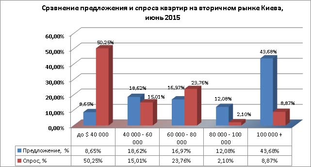 В июне 2015 года произошли существенные изменения в структуре спроса на вторичном рынке Киева. Покупатели интересуются поиском жилья в самом низком ценовом сегменте – до 40 000 дол. США. Таким образом, за месяц почти на четверть увеличилась доля интересующихся самыми "бюджетными" вариантами в столице. И, соответственно, снизился спрос на квартиры дороже 60 тыс. дол. США. В то же время, на фоне экономического кризиса в стране и увеличения объема предложения недвижимости, квартиры на вторичном рынке Киева продолжают дешеветь. За первый месяц лета медианная цена снизилась на 3,3%.