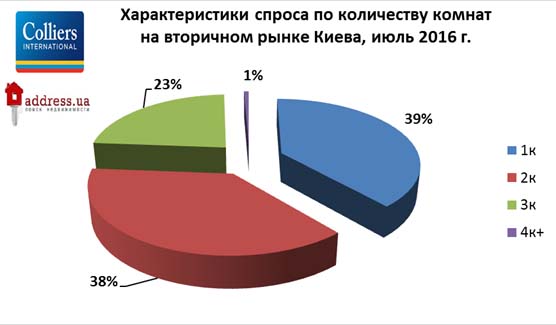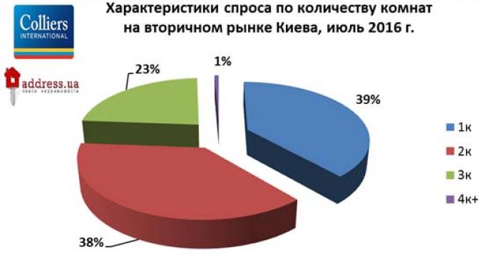Спрос на однокомнатные квартиры в июле 2016 г. был наивысшим в сравнении с другими группами жилья и составил 39%. 38% были сосредоточены в категории 2-комнатных, трехкомнатными квартирами в прошлом месяце интересовались 23% пользователей, ищущих недвижимость для покупки.