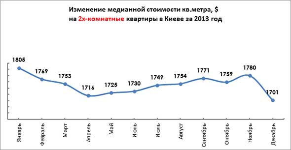 Количество квартир, выставленных на продажу на вторичном рынке Киева с марта по декабрь 2013 года увеличилось с 33 тыс. до 52 тыс. квартир. При этом, колебания в цене предложения продажи квартир данного сегмента в 2013 году были незначительными: к концу первого полугодия наблюдалось уменьшение на 1%, к концу второго полугодия – рост в 1%.