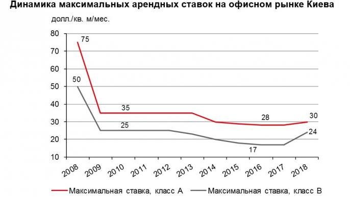 «Нехватка свободных офисных блоков вместе с быстрорастущим спросом привели к увеличению ставок аренды в обоих классах. Максимальная базовая месячная арендная ставка в классе А составила 30 долл. за кв. м в месяц (без учета НДС и операционных расходов), увеличившись за год на 2 долл., в классе В она достигла 24 долл. за кв. м, поднявшись с начала года на 7 долл. Мы ожидаем дальнейшего роста арендных ставок в 2019 году – на 3-6%», - прокомментировала аналитик компании JLL (Украина) Ульяна Марченко.