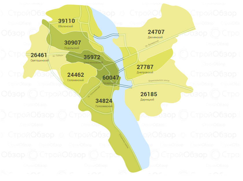 Неизменный лидер по стоимости жилья на первичке – Печерский район. Здесь стоимость квадратного метра на сегодня составляет 60 047 грн. Печерск обгоняет остальные локации с большим отрывом. Он никогда не терял первое место в нашем списке.