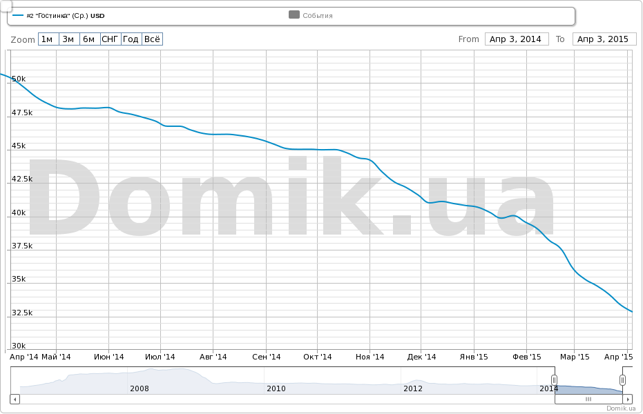 В долларах за квартиру средняя цена предложений «гостинок» за месяц снизилась на 9,0%, за три месяца снизилась на 19,3%, за полгода снизилась на 27,0%, за год снизилась на 34,8%.
