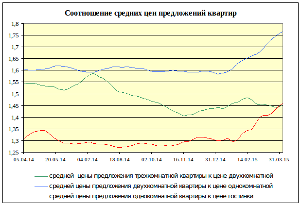 Соотношение средних цен предложений двухкомнатных и трехкомнатных квартир в первом квартале 2015 практически не изменилось.