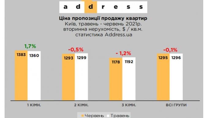 В июне 2021 года медианная цена предложения квартир на вторичном рынке Киева, представленных в базе данных портала Address.ua, осталась на уровне предыдущего месяца и составила 1295 долл. США/кв.м.