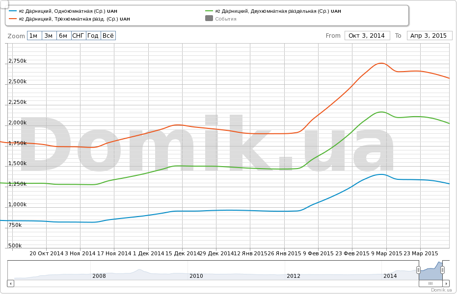 В ближайшем будущем, по мнению специалистов портала Domik.ua, нисходящие ценовые тренды наиболее вероятны как в долларах, так и в гривнах. Естественно, это при условии более-менее стабильного курса доллара, ибо даже отдаленное повторение тех процессов, которые происходили на валютном рынке в феврале, может привести к непредсказуемым последствиям.