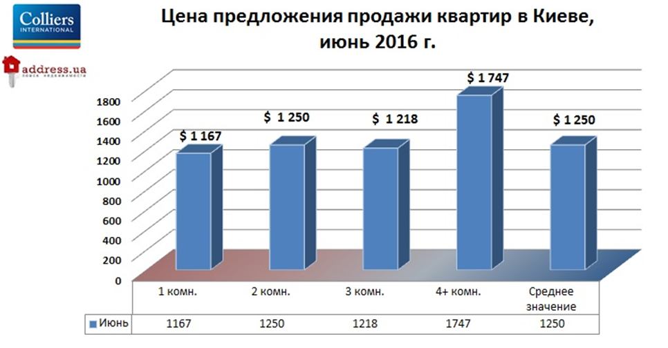 В июне медианная цена квартир на вторичном рынке Киева, представленных в базе данных Address.ua, составила 1250 долл. США/кв.м. Этот показатель в сравнении с маем продемонстрировал падение для 4-х и более комнатных квартир, хотя в группах 1-3-х комнатных квартир цены предложения увеличились.