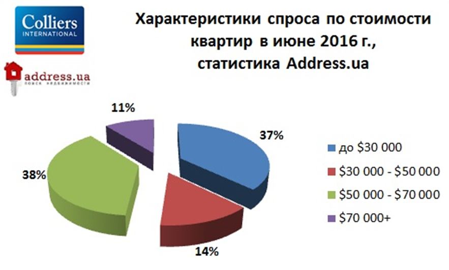 В июне почти сравнялся спрос на жилье в Киеве в двух ценовых диапазонах: до 30 тыс. долл. США и 50 тыс. – 70 тыс. Соответственно 37% и 38% пользователей при поиске жилья выбирали эти категории. Спрос на жилье с ценой от 70 тыс. долл. США остается невысоким – 11% запросов к базе данных портала.