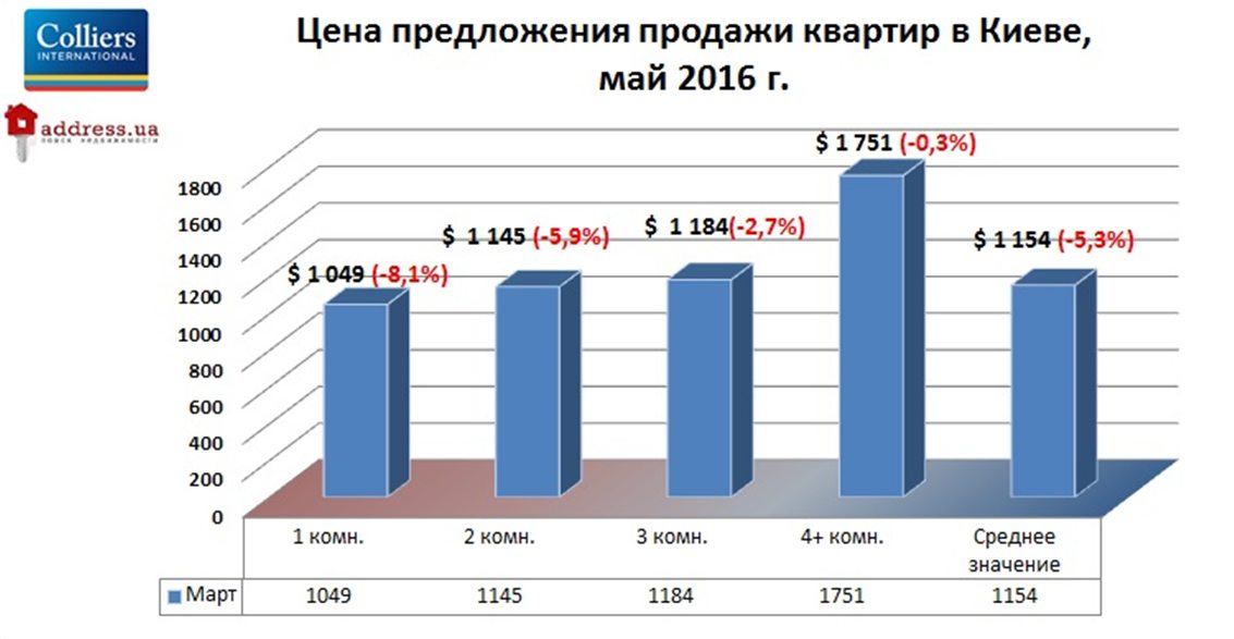 Как сообщили СтройОбзору аналитики портала Address.ua, в мае самую высокую динамику снижения цен демонстрировали квартиры небольшой площади. Так, медианная цена однокомнатных квартир снизилась за месяц на 8% до 1049 дол. США/кв.м. Двухкомнатные упали в цене на 6% до 1145 дол. США/кв.м. Медианная цена 3-х, 4-х и более комнатных квартир за этот период снизилась на 2,7 и 0,3% соответственно.