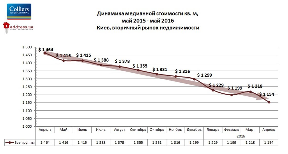 Для всех групп квартир, медианная цена за месяц опустилась на 5% до 1154 дол. США/кв.м.