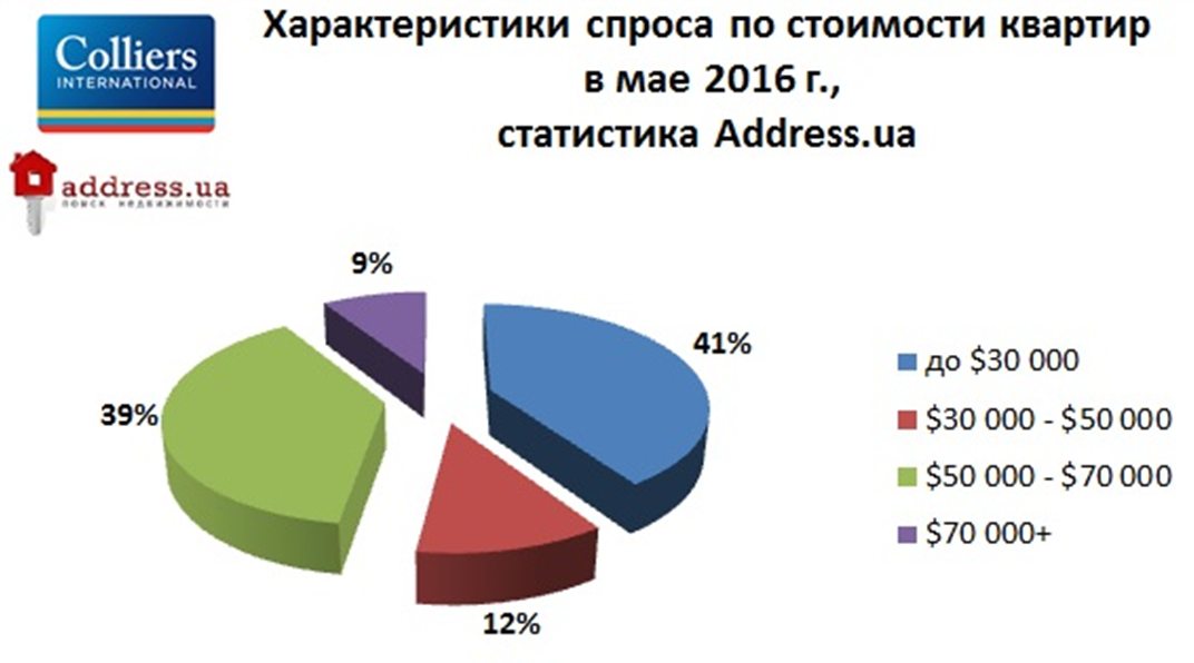 В мае основной спрос на жилье в Киеве находился  в диапазоне до 30 000 дол. США. В прошлом месяце 41% при поиске жилья выбирали этот ценовой диапазон.  На втором месте - квартиры стоимостью 50 000 – 70 000 дол. США – с долей запросов 39%.  Спрос на жилье с ценой от 70 000 дол. США остается невысоким – 9% запросов.