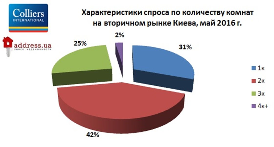 Спрос на двухкомнатные квартиры в апреле 2016 года был наивысшим в сравнении с другими группами жилья и составил 42%. 31% были сосредоточены в категории однокомнатных, трехкомнатными квартирами в прошлом месяце интересовались 25%.