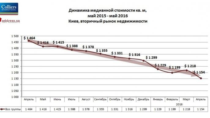 По итогам прошлого месяца медианная цена на вторичном рынке недвижимости Киева снизилась на 5% и составила 1154 дол. США/кв.м.