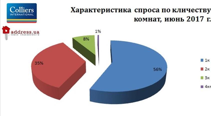 Спрос на однокомнатные квартиры в июне 2017 года был наивысшим в сравнении с другими группами жилья и составил 56%. 35% запросов были сосредоточены в категории 2-комнатных, трехкомнатными квартирами в прошлом месяце интересовались 8% ищущих недвижимость для покупки.