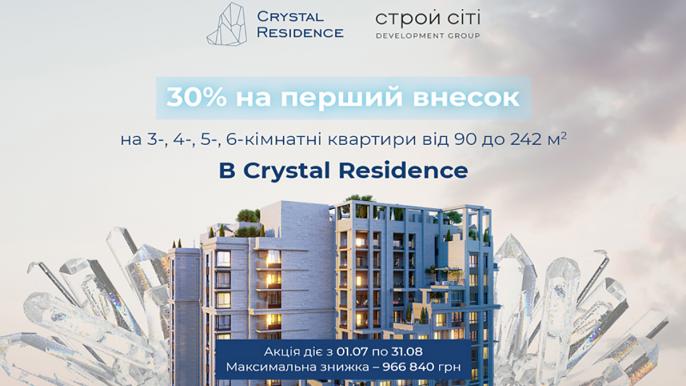 С 1.07.2021 по 31.08.2021 станьте владельцем просторной квартиры в Crystal Residence и получите 30% скидку на первый взнос!