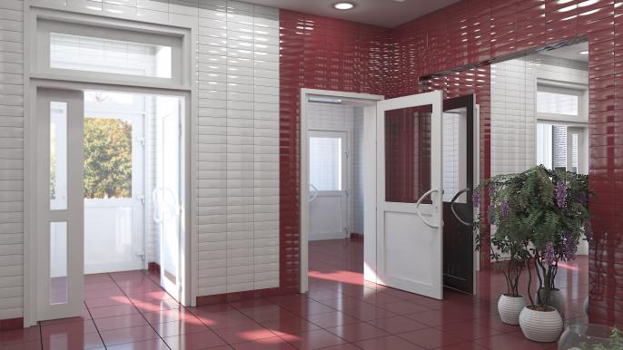 На первом этаже стены будут облицованы керамической плиткой белого, серого и красного цвета. На других этажах на стены нанесут краску таких же цветов, а на полу разместится комбинация из красной и белой плитки.